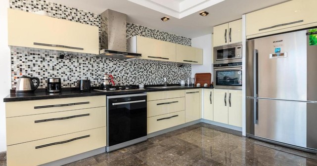 Кухня: просторная современная кухня открытого типа, оборудована всем необходимым: холодильник, посудомоечная машина, стиральная машина, духовой шкаф, варочная панель, электрочайник, посуда и кухонные принадлежности на 8 человек. Гостиная: зона отдыха с мягкой мебелью, спутниковым ТВ (LCD), Wi-Fi, кондиционером, обеденным столом на 6 персон и выходом на террасу у бассейна.