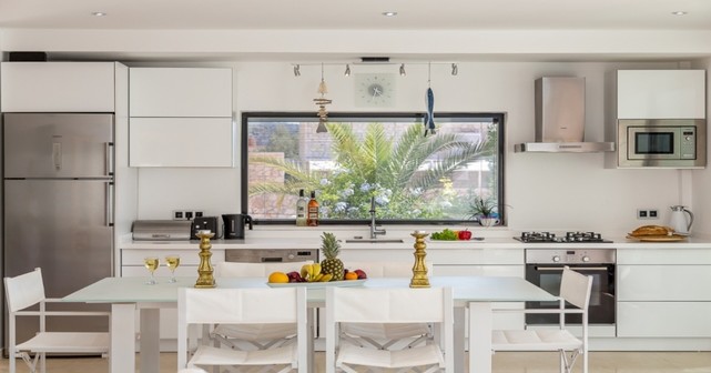 Первый этаж — просторная гостиная с выходом на террасу, панорамными окнами и видом на море, оснащённая спутниковым ТВ, Wi-Fi, кондиционером и обеденной зоной. Полностью оборудованная кухня с холодильником, посудомоечной и стиральной машинами, духовкой, плитой, микроволновкой, электрическим чайником, тостером и всем необходимым инвентарём. Также на этаже находится спальня с двумя односпальными кроватями и ванной комнатой.