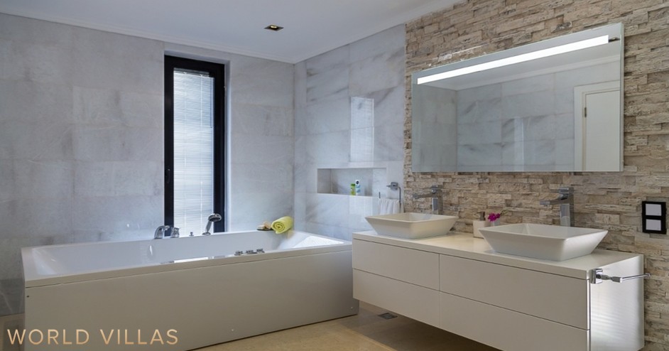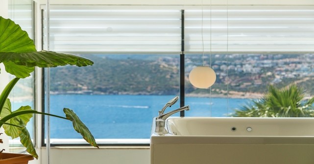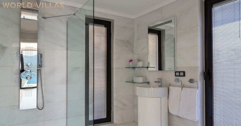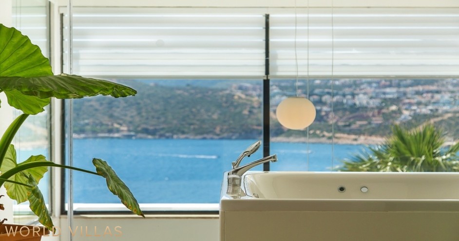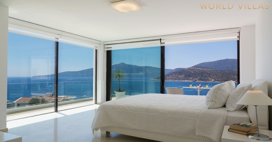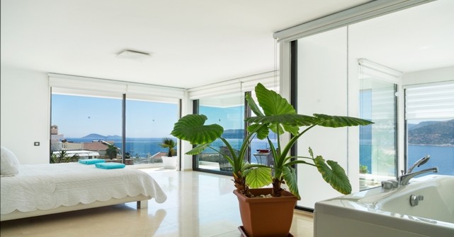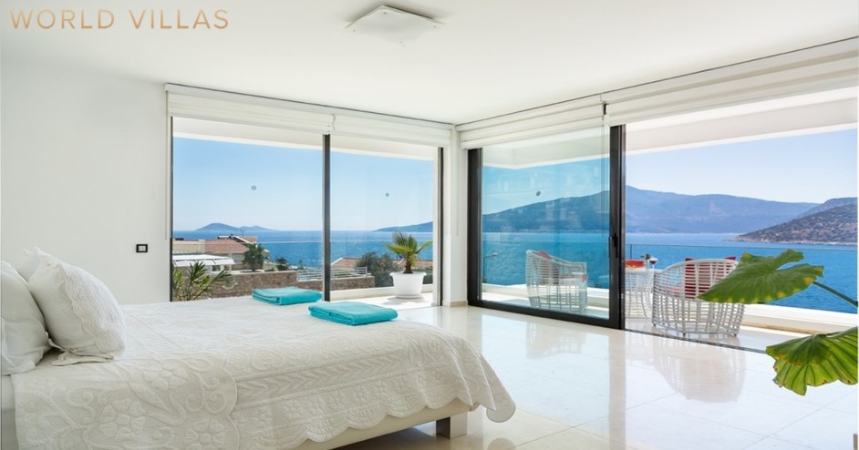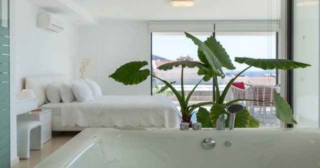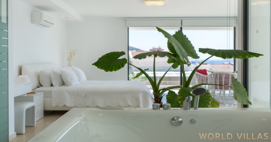 Второй этаж — главная спальня с двуспальной кроватью, ванной комнатой, джакузи и балконом с видом на море.